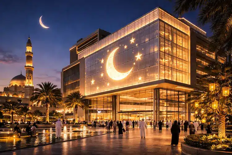 During Ramadan, commercial spaces and public buildings often extend their opening hours. Lighting therefore supports basic functionality while shaping festive ambience and spatial identity.