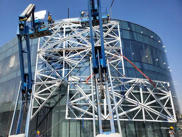 The curtain wall design adopts standard aluminum plate and glass curtain wall system. The construction workers need to lift it to a height of 60m to install it from the outside and . However, the construction required workers to be lifted 60 meters above ground to install the panels from the outside and seal it with glue. Considering the difficulty of construction, the curtain wall construction team planned to sets up a temporary cantilever steel platform at a high altitude as a working platform. After that, they removed the steel platform when completing the construction. Next, they used the aerial work platform vehicle to supplement the steel platform support structure to reserve the curtain wall gap.